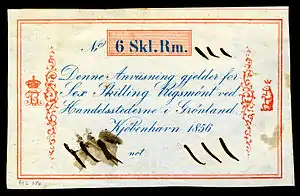 Попри значні розміри острів практично безлюдний. Так, за даними на 1888 рік, у підконтрольних Данії гренландських поселеннях проживало всього близько 10 тисяч осіб[92]. Для забезпечення грошового обігу торгове товариство періодично від 1803 року випускало банкноти, номіновані за аналогією з метрополією в ригсдалерах і скілінгах. Написи на цінних паперах державної торгової компанії повторювали данські. Так, на випусках 1819 1837, 1841, 1844 і 1848 років номінал зазначено або в ригсбанкдалерах, або в скілінгах[93]. У самій Данії ригсбанкдалер, рівний ½ спесіесригсдалера або 96 скілінгам, увели 1813 року[73]. Випуск 1856 року номіновано в ригсдалерах і скілінгах ригсмонт[94].