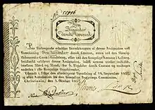 1695 року король Кристіан V подарував купцеві Йоргену Тормолену право на випуск власних банкнот, які могли бути використані на території Норвегії як законний платіжний засіб[106]. Надруковані купюри номіналом 10, 20, 25, 50 і 100 ригсдалерів стали першими норвезькими банкнотами[111]. Справи у купця незабаром розладналися і його оголошено банкрутом.