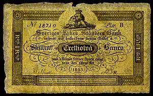 На банкнотах 1835—1855 років вказували два позначення — в риксдалерах банко і риксдалерах спесіє. Серед них є навіть такі нестандартні номінали, як 62⁄3 риксдалера банко (2,5 риксдалера спесіє) і 162⁄3 риксдалера банко (61⁄4 риксдалера спесіє)[62]. Ще однією особливістю стала поява двох типів розмінних грошових одиниць — скілінгів. Співвідношення 1 риксдалер — 48 скілінгів зберігалося, як для риксдалера банко, так і для риксдалерів спесіє. Виходячи зі згаданого курсу, риксдалер спесіє містив 128 скілінг банко. Від 1835 року карбували виключно «скіллінги банко», до 1835 — «скіллінг» без позначки «спесіє»[63][64].
