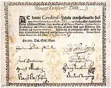 1661 року банк Стокгольма (швед. Stockholm Banco) випустив перші шведські банкноти. Спочатку вони були популярні в народі, оскільки їх було зручніше використовувати при розрахунках, порівняно з важкими мідними платами. Однак перший досвід виявився невдалим. Неконтрольований випуск паперових грошей призвів до їх знецінення. 1664 року банк мусив припинити вільний обмін на металеві гроші. Особливості шведського грошового обігу спричинили за собою випуск купюр не тільки різного номіналу, а й різних систем далерового обігу — від 50 до 1000 риксдалерів спесіє, від 50 до 1000 далеров «silvermynt» і від 12½ до 1000 далерів «kopparmynt»[41]. Риксдаг ухвалив припинити обіг паперових грошей і обміняти їх на металеві за номінальною вартістю. Збанкрутілий банк закрили. 1668 року відкрили Риксбанк, найстаріший центральний державний банк, який знову налагодив випуск банкнот[42].