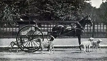 Супровід кінних екіпажів, сила, витривалість і безстрашність зробили цих собак постійними супутниками англійської знаті. Далматини бігли під передньою віссю екіпажу і могли нарівні з кіньми долати великі відстані. А під час зупинок, віддані тварини ластились і розважаючи своїх господарів, не забували пильно охороняти їх спокій. При найменшій небезпеці відважно вступали в бій як з дикими тваринами, так і з лісовими розбійниками. Саме тому у «каретних собак» були куповані висячі вуха, які найбільше страждали під час бійок. Купірування вух у далматинів припинилося лише з 1860 року і заборонено з 1895 року Кеннел-клубом Великої Британії.