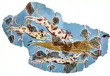 Добре збереглася фреска з Тиринфа з зображенням сцени полювання, де собаки із забарвленням далматина женуть дикого кабана. Ця фреска була зроблена в Греції в Мікенську епоху (1600—1100 роки до н. е.), зараз вона зберігається в Національному археологічному музею в Афінах.