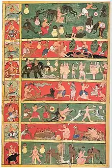 Нараки — буддійська картина XVII століття (ткане полотно), зображує сім рівнів Джайн пекла. Собака дуже схожа на далматина зображена як пекельна істота, місцевий мешканець, який піддає різним мукам душі тих нещасних, кому судилося там опинитися (ліва панель зображує демо-бога і його тварин, що керують кожним пеклом).