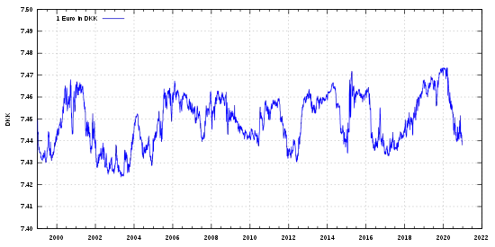 | 1 EUR = | 7,46 DKK (18 лютого 2022) |