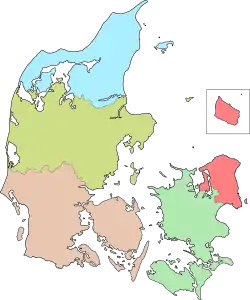 Данія поділяється на п'ять адміністративних регіонів, створених 1 січня 2007 року в рамках адміністративної реформи, коли традиційний поділ країни на 14 амтів (сім амтів були розташовані в Ютландії, сім — на Данських островах (в тому числі два амта в межах Копенгагена)[11]) змінила нова система поділу на п'ять регіонів. Також тоді було скорочено кількість муніципалітетів із 270 до 98 — більш дрібні муніципалітети були об'єднані в більш великі одиниці. Більшість муніципалітетів мають населення, принаймні 20 000 людей, щоб мати фінансову та професійну стійкість, хоча з цього правила були зроблені кілька винятків.[23] Найбільш східна земля в Данії, архіпелаг Ertholmene, з населенням 90 (2014) і площею 39 га, не є ні частиною муніципалітету, ні регіону, але належить Міністерству оборони.[24] Королівство Данія є унітарною державою, проте Фарерським островам і Ґренландії було надано самоврядування (політична автономія). Великі повноваження були передані Фарерським островам і Ґренландії, які мають свої власні уряди і законодавчі органи та які ефективно самоврядовуються щодо внутрішніх справ.[25] Тим не менше, вони законодавчо підпорядковані Фолькетингу, де ці дві території представлені двома місцями кожна. Верховні комісари (Данська: Rigsombudsmand) виступають як представники данського уряду в Фарерських островах і в парламенті Ґренландії, але вони не можуть голосувати.[25] Фарерський уряд визначається рівноправним партнером з данським урядом в акті 2005 р.,[26][27] а люди Ґренландії визначаються як окремий народ із правом на самовизначення.[28]