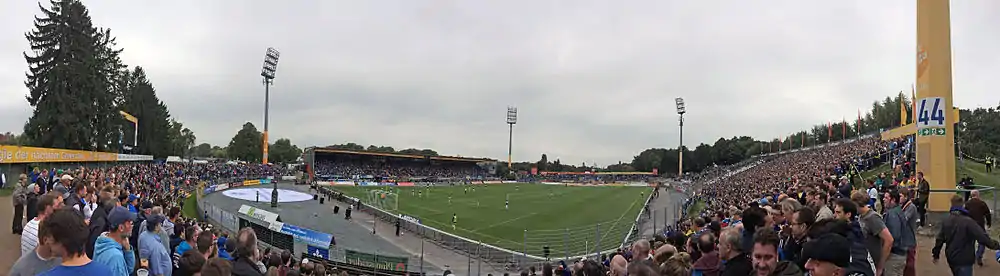 - Трибуни являють собою довгу дугу з лавками, а то й лише зі стоячими місцями. Курити дозволено всюди і пиво ллється рікою. Неясно, як такий стадіон допустили до матчів Бундесліги, але факт в тому, що купити одиночний квиток на матч просто нереально