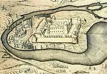 Раніше і монастир, і замок знаходилися на лівому березі Даугави, але у 1567 році Даугава прорвала берегові дюни і утворила новий витік у море, що знаходився приблизно у 5 км далі на захід; тоді ж поляки збудували невелике укріплення на тому місці, де зараз знаходиться Даугавгріва.
