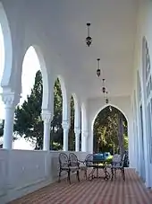 Оскільки у термін, обумовлений з Тарасовими, багато із запланованого виявилося недоробленим, Управління справами великого князя запросило для якнайшвидшого завершення робіт в «Кічкіне» відомого ялтинського архітектора Л. М. Шаповалова (автора проекту і будівельника «Білої дачі» А. П. Чехова). Йому, зокрема, належало авторство зручних мармурових сходів до моря, а спільно з феодосійським скульптором Л. В. Коржіновським, архітектор завершив всі роботи з декорування парадного входу і фасадів палацу ліпними орнаментами в східному стилі.