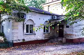 За основним будинком розташований одноповерховий, прямокутний у плані флігель із вальмовим дахом і пласким перекриттям. Будівля зведена у цегляному стилі[12].