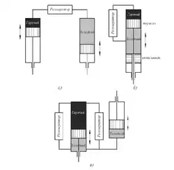 - Правий поршень рухається вліво, а лівий рухається вниз. Це призводить до переміщення газу у циліндр, що нагрівається. У ньому газ розігрівається, тиск збільшується і цикл повторюється.