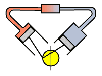 Однією з можливих конструкцій двигуна Стірлінга є розташування його циліндрів під кутом 90° (як на ілюстрації циклу вище).