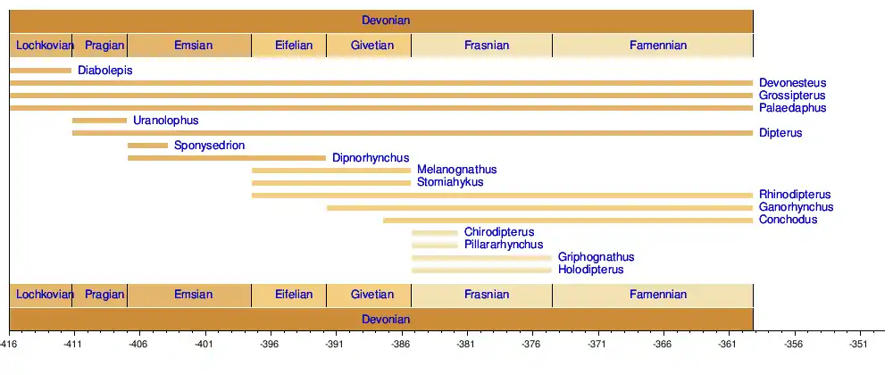 ? Дводишні рибиЧас існування: ранній девон — сьогодення | ||||||||||||||||