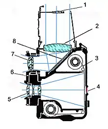 Один із об'єктивів містить механізм затвору і використовується для формування зображення на фотоплівці чи фонопластині. Додатковий об'єктив використовується у вузлі видошукача.[1] Крім об'єктива вузол видошукача містить дзеркало, жорстко закріплене під кутом 45 градусів до оптичної осі об'єктива (звідси і слово дзеркальна у назві), та матове скло (фокусувальний екран), на якому об'єктив і формує видиме зображення. Також вузол видошукача може містити складку кришку-шахту.