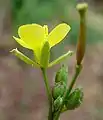 Суцвіття — малоквіткова, розлога китиця. Квітки двостатеві, світло-сірчано-жовті. Чашолистків 4, вони голі або у верхній частині слабо волосисті, їх довжина сягає 3,5–5,5 мм. Оцвітина складається з 4 обрененояйцеподібних пелюсток завдовжки 4,5–10 мм, завширшки 4–5 мм. Тичинок 6, завдовжки 3,5–6 мм кожна. Пиляки відносно великі (1,5–2 мм завдовжки), жовті. Плід — голий розкривний стручок завдовжки 2–4 см. Насінини еліптичної форми, завдовжки 0,9–1,3 мм, завширшки 0,6–0,9 мм.