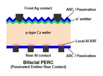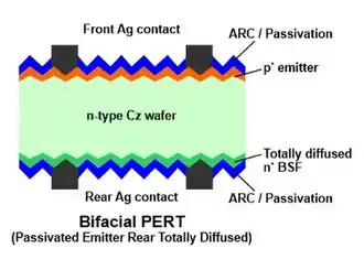 - Переважно виготовляється (напр JA Solar, LONGi, Trina ), наприклад, на пластині c-Si типу p