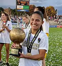 | Дебінья тримає в руках свій трофей MVP NWSL-2019 | ||||||||||||||||||||||||||||||||||||||||||