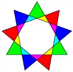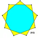 Існує три зірчастих дев'ятикутники: {9/2}, {9/3} та {9/4}, причому зірка {9/3} складається з трьох рівносторонніх трикутників:
