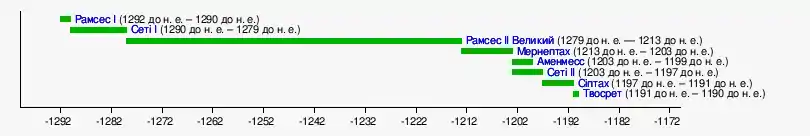 Мернептах (1212—1202 рр. до н. е.) — Один з безлічі синів Рамсеса II, став фараоном лише в 60 років, настільки довго правив його батько. Відбив одну з перших навал «Народів моря». Мернептаха успадковував його син, Сеті II (1202—1195 рр. до н. е.), під час правління якого трон був узурпований Аменмесом (1200—1196 рр. до н. е.), імовірно був онуком Рамсеса II. Після смерті Сеті II трон успадкував його син Саптах (1194—1188 рр. до н. е.), при регенстві своєї мачухи Таусерт, що стала після смерті Саптаха останнім фараоном XIX династії (1188—1186 рр. до н. е.). Правила вона недовго і з її смертю почалася анархія, в ході якої до влади прийшла XX династія.