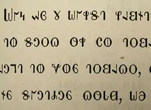 | 𐐘 𐑀 | Gay | /ɡ/ | 𐐙 𐑁 | Ef | /f/ | 𐐚 𐑂 | Vee | /v/ | 𐐛 𐑃 | Eth | /θ/ |