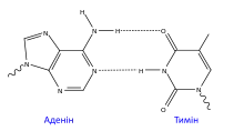 У ДНК зустрічається чотири види азотистих основ (аденін, гуанін, тимін і цитозин). Азотисті основи одного з ланцюгів сполучені з азотистими основами іншого ланцюга водневими зв'язками згідно з принципом комплементарності: аденін з'єднується тільки з тиміном, гуанін — тільки з цитозином.