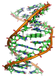 Полімер ДНК має досить складну структуру. Нуклеотиди ковалентно сполучені між собою в довгі полінуклеотидні ланцюги. Ці ланцюги в переважній більшості випадків (окрім деяких вірусів, що мають одноланцюговий ДНК-геном), у свою чергу, попарно об'єднуються за допомогою водневих зв'язків у структуру, що отримала назву подвійної спіралі[16][6].