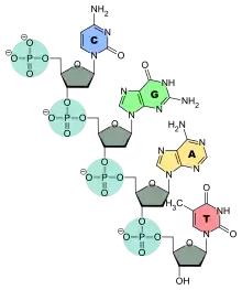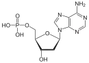 Дезоксирибонуклеїнова кислота є біополімером (поліаніоном), мономерами якого є нуклеотиди[4][5]. Кожен нуклеотид складається із залишку фосфорної кислоти, приєднаного за 5'-положенням до цукру дезоксирибози, до якого також через глікозидний зв'язок (C—N) за 1'-положенням приєднана одна з чотирьох азотистих основ. Саме наявність характерного цукру і складає одну з головних відмінностей між ДНК і РНК, зафіксовану в назвах цих нуклеїнових кислот (до складу РНК входить цукор рибоза)[6]. На малюнку показано чотири основи та один із нуклеотидів — дезоксаденозинмонофосфат, утворений приєднанням аденіну до дезоксирибози й фосфату.
