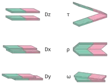 - шифт (англ. shift, Dx), слайд (англ. slide, Dy), райз (англ. rise, Dz) — характеризують зсув однієї пари основ відносно іншої без зміни куту площини пар основ, так, що вони залишаються паралельними;