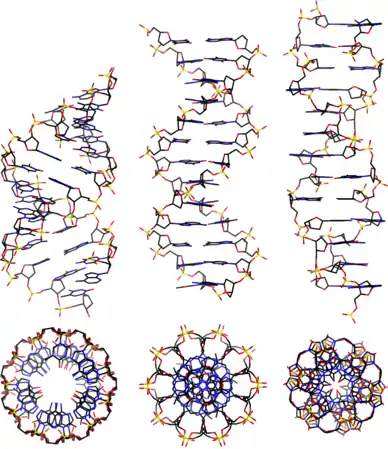 У залежності від концентрації іонів і нуклеотидного складу молекули, подвійна спіраль ДНК у живих організмах існує в різних формах. На малюнку (зліва направо) представлені A-, B- і Z-форма