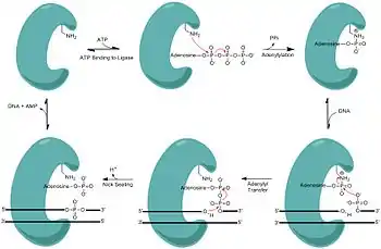 ДНК-лігази зшивають цукрофосфатні остови молекул ДНК, використовуючи енергію АТФ. Вони особливо важливі в процесах реплікації ланцюга, що запізнюється, з'єднуючи між собою фрагменти Окадзакі. Крім того, вони використовуються в репарації ДНК і гомологічній рекомбінації[73]. У лабораторних дослідженнях лігази широко використовуються в клонуванні і фінґерпринтингу.