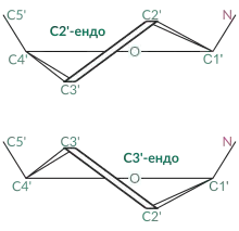 Дезоксирибоза, що входить до складу молекули ДНК, знаходиться переважно в С2'-ендо конформації, на відміну від С3'-ендо конформації рибози в молекулах РНК: відсутність OH-групи у 2 положенні дезоксирибози робить С2'-ендо конформацію можливою. Це надає ДНК структурної міцності й ригідності, на відміну від молекули РНК.[7]
