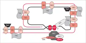 Теломера зв'язана зі специфічними білковими структурами, такими як шелтерин.[49]