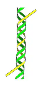 Якщо узятися за кінці мотузки й почати скручувати їх у різні боки, вона стає коротшою і на мотузці утворюються великі «супервитки». Також може бути суперскручена й ДНК. У звичайному стані ланцюжок ДНК робить один оберт на кожні 10,4 основи, але в суперскрученому стані спіраль може бути згорнута тугіше або розплетена[45]. Виділяють два типи суперскрученості: позитивну — у напрямі нормальних витків, при якому основи розташовані ближче одна до одної; і негативну — в протилежному напрямку. У природі молекули ДНК зазвичай перебувають в стані негативної суперскрученості, який вноситься ферментами, — топоізомеразами[46]. Ці ферменти вилучають додаткову скрученість, що виникає в ДНК в результаті транскрипції та реплікації[47].
