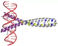 Водночас інші білки розпізнають специфічні послідовності й приєднуються до них. Найбільш вивчена група таких білків — різні класи факторів транскрипції, тобто білки, що регулюють транскрипцію. Кожен з цих білків розпізнає свою послідовність, часто в промоторі, й активує або пригнічує транскрипцію гену. Це відбувається при асоціації факторів транскрипції з РНК-полімеразою або безпосередньо, або через білки-посередники. Полімераза асоціює спочатку з білками, а потім починає транскрипцію[67]. В інших випадках фактори транскрипції можуть приєднуватися до ферментів, які модифікують гістони, що знаходяться на промоторах, і, таким чином, змінюють доступність ДНК для полімераз[68].
