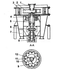 1) Стержнева дробарка або млин, машина для руйнування крихких малоабразивних матеріалів (сухої глини, вугілля, коксу, солі, торфу, сірки тощо). Складається з двох роторів (кошиків), які обертаються у протилежні сторони, насаджених на співвісні вали і взятих в кожух. На дисках роторів по концентричних колах розташовані 2-4 ряди циліндричних пальців (бил) так, що кожний ряд одного ротора вільно проходить між двома рядами іншого. Крупність завантажуваного матеріалу 60-90 мм, а дробленого 0,5-0,1 мм. При подрібненні вугілля продуктивність Д. великого розміру (діаметр ротора 1250 мм) 80-90 т/год.