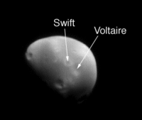 Станом на 2019 рік на Деймосі тільки дві деталі поверхні мають власні імена. Це кратери Свіфт (діаметром 1 км) і Вольтер (1,9 км). Вони названі на честь письменників (Джонатана Свіфта й Вольтера), які передбачили існування в Марса двох супутників ще до їхнього відкриття. Обидва кратери отримали назви у 1973 році[9][10].