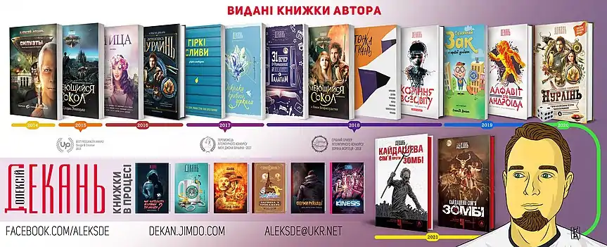 | Що мені подобається в творах Олексія Деканя? Свобода думки, увага до сюжетних деталей, яскравість ідей, живі та насичені письменницькі фарби. Сторінки гортаються дуже швидко. Написано легко, одним подихом. Із кожним розділом чтиво захоплює все більше. Автору є чим здивувати своїх прихильників. |