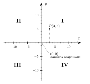 Перетин двох осей створює чотири квадранти на координатній площині, які позначаються римськими цифрами I, II, III, та IV. Зазвичай порядок нумерації квадрантів — проти годинникової стрілки, починаючи з правого верхнього (тобто там, де абсциси та ординати — додатні числа). Значення, яких набувають абсциси та ординати в кожному квадранті, можна звести в наступну таблицю: