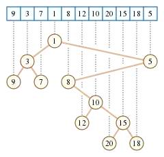 - Дерево має властивість купи: предок будь-якого не кореневого вузла містить менше значення ніж той вузол. (Іноді порядок перевертають, так що предок містить більше значення, а корінь — максимальне).