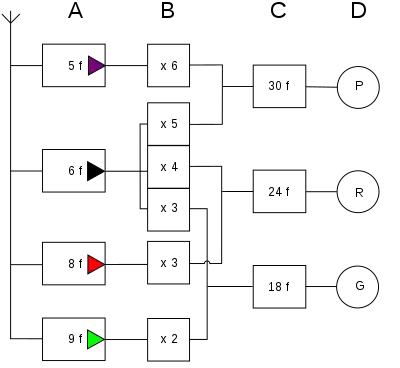 | Колір | Гармоніка веденої | Множник веденої | Гармоніка ведучої | Множник ведучої | Результуюча частота |