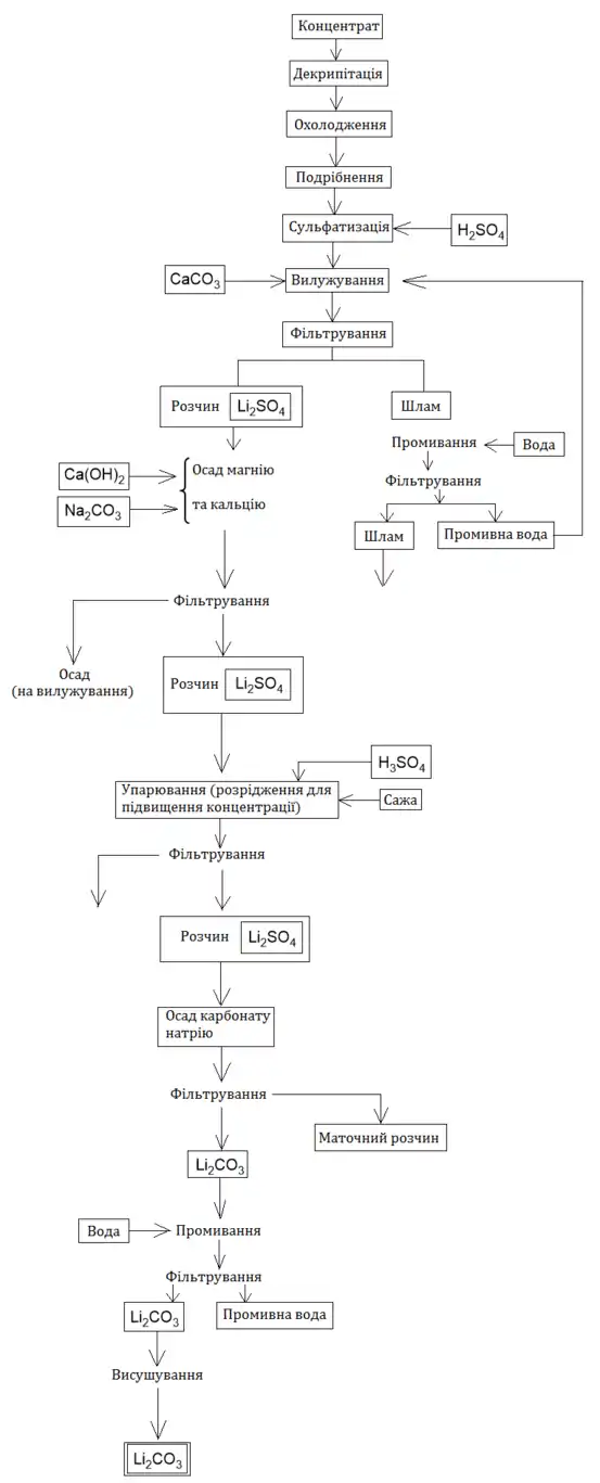 Розчин, після вилучення літію з піску, містить (до 100г/л), сульфат натрію й ряд домішок, які до осаду повинні бути видаленими. Спочатку розчин очищують від магнію, нейтралізуючи вапном до рН 12-14, магній осаджується у вигляді Потім видаляють кальцій у вигляді обробляючи розчин кальцифікованою водою (12 кг/м3). Після відділення на фільтр-прес залишків та які по мірі накопичення вилужують водою до вилучення літію, розчин залишається забрудненим алюмінієм (з рудного матеріалу переходить 2-4%) та залізом (з кородуючих трубопроводів). Для видалення цих домішок у вигляді розчин нейтралізують сірчаною кислотою (до рН 7). Кислоту подають у живильних однокорпусного випарувального апарату, призначеного для концентрування розчину до близько 200г/л . Після концентрування у розчин вносять для обезбарвлення трохи газової сажі, яка потім видаляється з осадом на рамному фільтрі. Очищений таким чином концентрований розчин надходить до реактору на стадію отримання . Карбонат літію осаджують кальцифікованою содою за 90 градусів. Кристали після відділення маточного розчину промивають деіонізованою водою. Таким чином, карбонат літію після промивання містить близько 80% основної речовини. Після другого промивання - вже 96-97%. Після відмивання й центрифугування сушать (із 10%-ю вологістю) при 510-635 мм.рт.ст. Така схема застосовується лише для -сподумену[1].