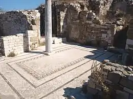 На південь від священної ділянки розташовуються житлові квартали, по руїнах можлива реконструкція багатьох будинків з розташованими навколо внутрішнього дворика приміщеннями. Будинки були прикрашені мозаїками і розписами, що збереглись у великих кількостях. На південній околиці району на початку 3 століття до н. е. був збудований театр просто неба. Амфітеатр перетворився на руїни, але добре збереглася мармурова стіна, що оточувала його.