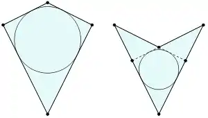 - У будь-який опуклий дельтоїд можна вписати коло, крім цього, якщо дельтоїд не є ромбом, то існує ще одне коло, яке дотикається до продовжень всіх чотирьох сторін. Для неопуклого дельтоїда можна побудувати коло, що дотикається до двох більших сторін і продовжень двох менших сторін і коло, що дотикається до двох менших сторін і продовжень двох більших сторін.