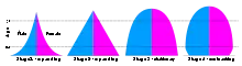 - Третій етап характеризується підвищенням показників смертності за рахунок старіння населення (покращення медицини, харчуваня і санітарно-епідеміологічного середовища найбільше впливає на очікуваний середній вік нових поколінь, старше покоління несе «тягар» попередньої епохи), при повільному зниженні народжуваності (діти більше не помирають у малому віці й потребують все більше ресурсів і часу на своє виховання). Внаслідок такого часового лагу природний приріст продовжує наростати, відбувається перехід до слабкорозширеного відтворення населення, пізніше до його зменшення — депопуляції[1]. Коефіцієнт смертності збільшується (S(x) зростає) (внаслідок демографічного старіння), а також сповільнюється зниження коефіцієнта народжуваності (R'(x) спадає). До кінця третього етапу коефіцієнт народжуваності приблизно дорівнює рівню простого відтворення, а коефіцієнт смертності нижче рівня простого відтворення. R(x) ≈ 2,1, S(x) < 2,1, де 2,1 — рівень простого відтворення. Статево-вікова піраміда вирівнюється в своїй основі (кількість народжених і померлих дітей урівноважується).