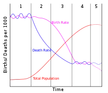 Загальна схема процесу демографічного переходу складається з 5 послідовних фаз, кожна з яких в різних регіонах Землі відбувається за власним сценарієм, але має певні спільні риси з аналогічними фазами в інших регіонах. Позначимо коефіцієнт народжуваності через R(x), коефіцієнт смертності через S(x), тоді приріст коефіцієнта народжуваності буде R'(x), а коефіцієнта смертності буде S'(x).