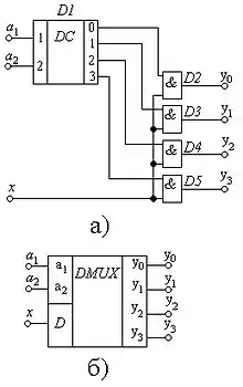 Входи дешифратора a1, а2 є адресними. Тому в залежності від адресного числа лише на одному з виходів дешифратора з'являється логічна одиниця, яка дає дозвіл до спрацювання лише одного з чотирьох кон'юкторів D2…D5. На другі входи кожного кон'юктора надходить шина сигналу x.
