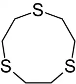 Тридентатний циклічний ліганд —1,4,7-тритіоциклононан, координація відбувається через атоми сульфуру.