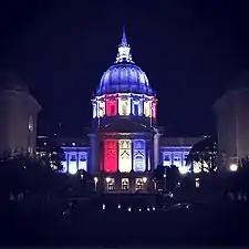 ![]() День виборів Міська ратуша Сан-Франциско засвітилася спеціальним червоним, білим та синім світлодіодним освітленням вночі 6 листопада 2018 року, щоб відзначити День виборів по всій території США | |