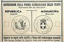 2-го і 3-го червня 1946 року в Італії був проведений інституційний референдум, де італійці повинні були обрати форму державного правління — республіку чи монархію. Референдум було проведено через кілька років після закінчення Другої Світової війни, повалення фашизму та диктатури.Члени королівської родини були вигнані з країна, за зв'язок із фашистським режимом. Це було перше загальне офіційне голосування в Італії. Близько 60 % голосів було на рахунок республіки, це означало, що італійці вирішили остаточно розпрощатися з монархією. Результат референдуму був офіційно ратифікований 18 червня 1946 коли Верховний суд оголосив про народження Італійської Республіки.[1]