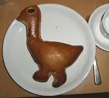 Як свідчить легенда, традиція подавати печеного гусака склалася ще за життя Мартина Турського. Під час однієї з його проповідей поруч знаходяться гуси, що підняли шум і єпископ Мартин наказав зробити з них печеню. Відтоді, щорічно 1 листопада сім'ї печуть гусака і подають його до столу як пам'ять про цього святого. Додатково до цього готуються солодкі чотирикутні вафлі або булки у вигляді підкови, які носять назву — «ріжки святого Мартина» або «Мартинів ріг». Близько ста п'ятдесяти років тому ще існував звичай, за яким під стелею кімнати підвішувалися паперові кульки з яблуками, горіхами, родзинками, зернами пшениці, вівса, гороху. Додатково до кожного пакету кріпилися паперові смужки, які підпалювали і вміст пакетів висипалося на святкуючих. Все це символізувало закінчення врожаю, радість достатку врожаю[6].
