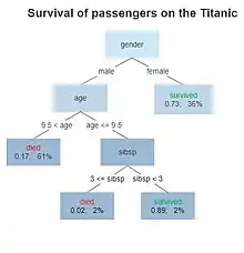 Навчання на дереві рішень - це метод, який зазвичай використовується в аналізі даних.[1] Мета - створити модель, яка передбачає значення цільової змінної на основі кількох вхідних змінних.